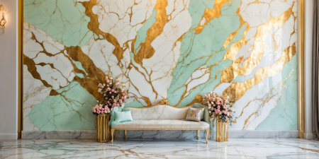 Living room interior with stone wall in gold and mint colors
