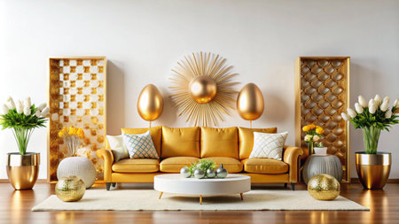 Modern living room interior with gold decor and Easter eggs.