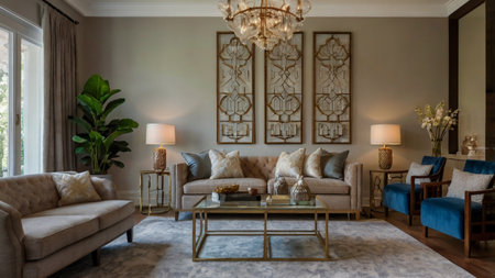 Experience the charm of this elegant living room featuring modern furniture and stylish decor. The warm colors and chic accessories create a cozy atmosphere.