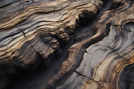 Abstract close up of layered rock formation with cracked earth textures in earthy tones.