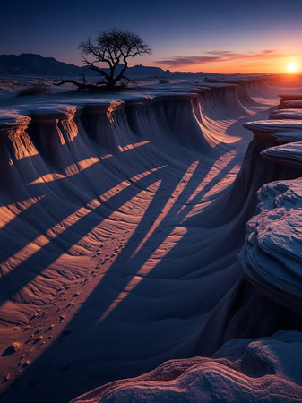 A dramatic sunset casts long shadows across an eroded desert landscape featuring layered rock formations and a solitary tree against a vibrant sky.