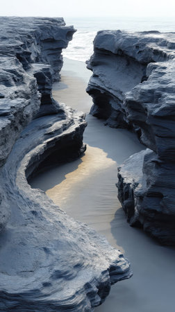 Winding rock formations lead to a tranquil beach, illuminated by the soft morning light.