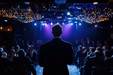 A man stands in front of a crowd of people in a dark room. The man is dressed in a suit and tie and is giving a speech. The audience is attentive and listening to the man's words