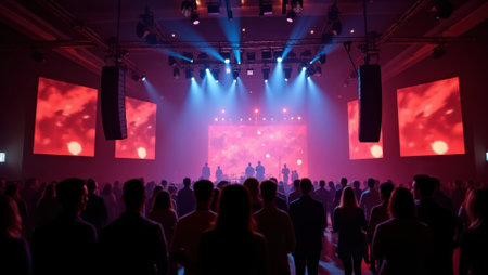 A crowded concert hall arena with scene stage lights with musicians band on a stage at the venue, rock show performance, with concert-goers attendees, audience on dance floor during concert festival