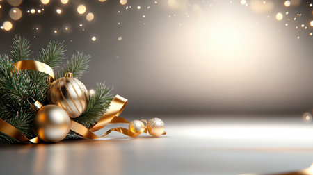 Luxurious Christmas background with deep green fir branches intertwined with golden ribbons and sparkling gold baubles, creating an opulent festive setting.
