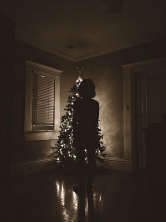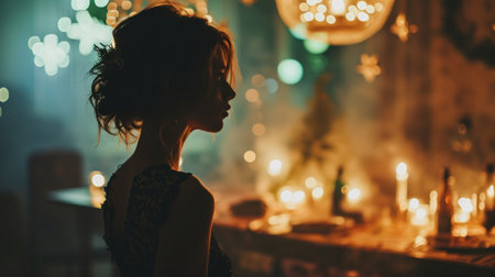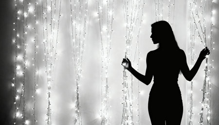 Woman silhouette stands among hanging vertical fairy lights with soft bokeh glow in a monochrome studio scene, high contrast and clear negative space on the left with available area for text or graphic elements