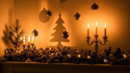 A close-up view of traditional Christmas ornaments and pine branches casting long, dramatic shadows on a textured surface, evoking a festive holiday mood.