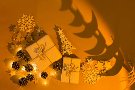 Christmas at sunset. Gifts, a garland with deer, decorations, snowflakes and a tree shadow in warm orange light. Top view