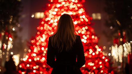 A woman admires a beautifully lit red Christmas tree at night in a festive urban setting during the holiday season