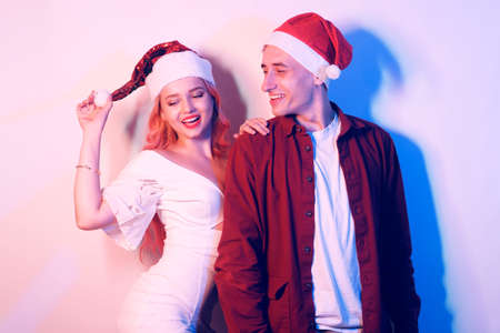 Couple in santa hats, new year, christmas. Lovers in neon light. Girl in evening dress with accessories, with red lips and pink hair. Couple dancing and having fun