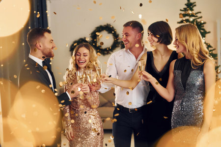 Joyful friends laughing and toasting with champagne glasses during a festive celebration. Confetti falls around them as they enjoy a lively party with warm lights.
