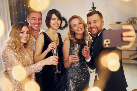 Young multi ethnical friends in Santa Claus hats celebrating New Years Eve, having fun and clicking their glasses with Champagne at the New Years party. Indoors. Portrait shot