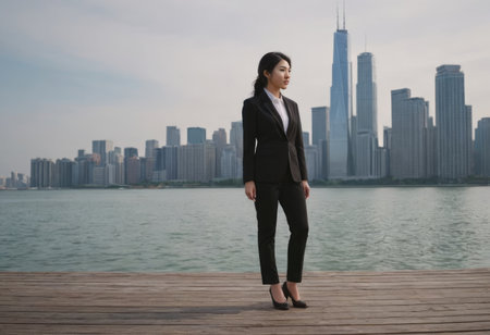 A stylish woman, dressed in a tailored suit, is confidently standing on a wooden pier, with a stunning city skyline visible in the background