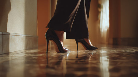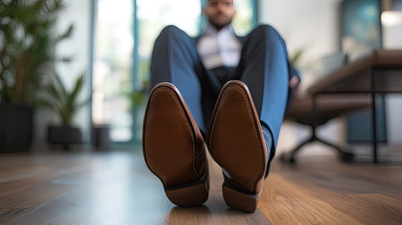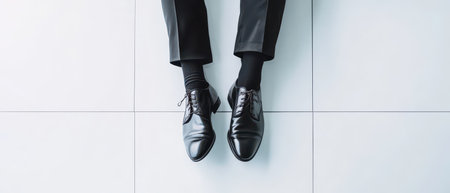 Black dress shoes on a polished floor suggest a formal business setting. The image conveys professionalism and attention to detail.