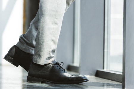 cropped shot of stylish businessman standing in fashionable leather shoes and pants