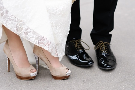 man shoes and woman black high heels shoes on brown wooden background with copy space