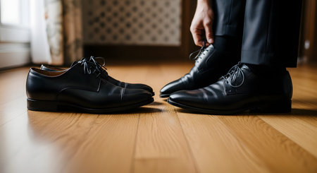 A close-up view of a man tying the laces of black leather oxford shoes while another pair sits on the wooden floor. The image highlights formal footwear, grooming, and preparation for an event.