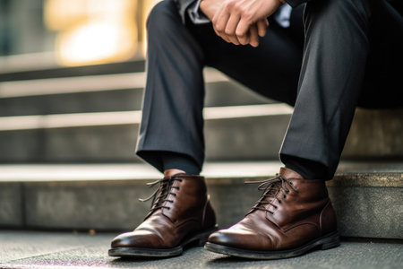 Cropped shot of businessman wearing suit and elegant shoes sitting on sidewalk at city street. Leadership and success concept. Created with Generative AI