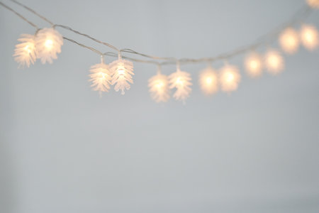 View of string light in the shape of pinecone lights background with copy space. Christmas garlands and lights decoration. Selective focus.