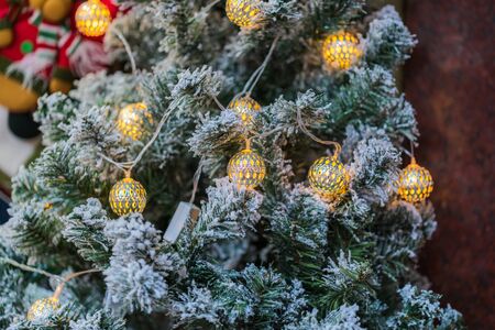 Decorated Christmas tree with glowing garland. Selective focus.