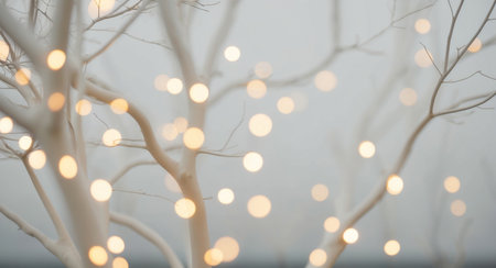 This enchanting image captures a delicate arrangement of fairy lights intertwined with bare branches, set against a soft misty background, creating a peaceful and magical atmosphere.