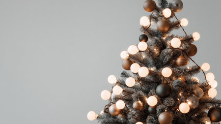 A beautifully decorated Christmas tree featuring glowing string lights and elegant ornaments set against a soft gray backdrop, creating a cozy holiday atmosphere.