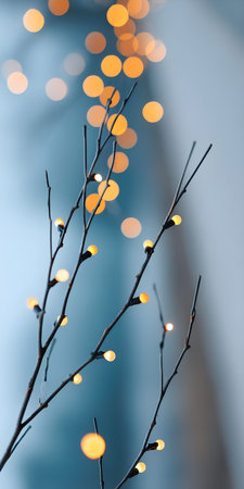 Enchanting Winter Scene with Twinkling Lights on Frosty Twigs Amidst a Soft Snowy Landscape