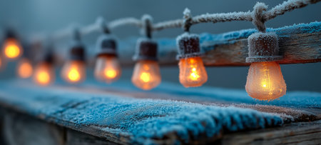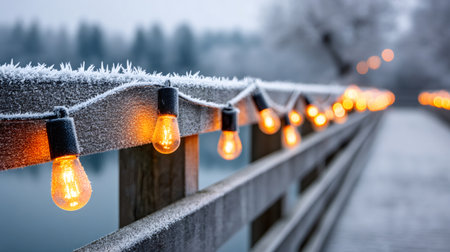 Glowing string lights illuminating frosty wooden bridge railing in winter