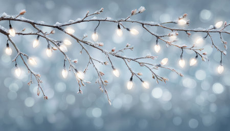 A beautifully frosted branch showcases warm glowing lights, creating an enchanting winter atmosphere filled with peaceful serenity and captivating beauty.