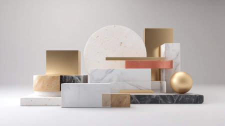 Visualize a contemporary still-life composition featuring geometric forms in gold and marble. This image blends elegance with minimalism, perfect for modern decor.