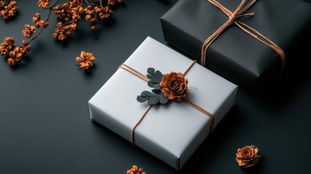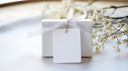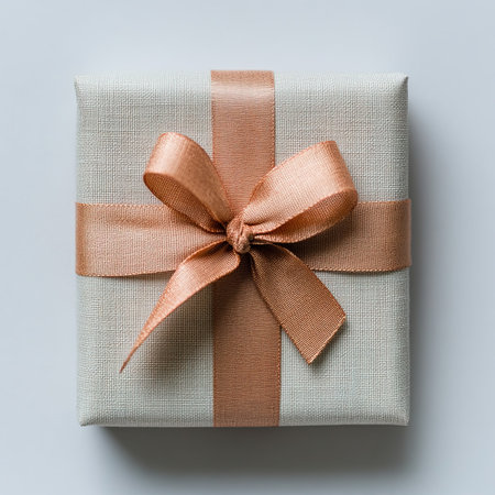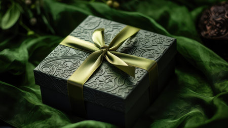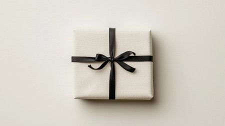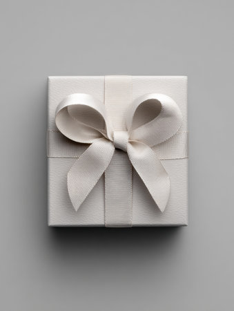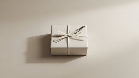 A close-up view presents a square gift box tied with a satin ribbon and adorned with a delicate sprig. The box rests on a smooth, neutral surface, with soft lighting and subtle shadows. The design suggests a refined aesthetic, suitable for various promotional or editorial applications requiring a touch of sophistication.