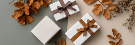 Three beautifully wrapped gift boxes with ribbons sit on a pastel surface, surrounded by dried autumn leaves, conveying a warm seasonal aesthetic.