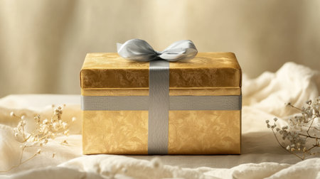 This stunning image showcases an elegant golden gift box adorned with a silver ribbon, set against a soft fabric background. Perfect for special occasions or celebrations.