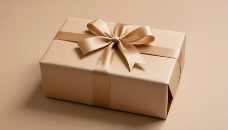 A beautifully wrapped gift box with a luxurious gold ribbon stands out against a soft textured background, ideal for various festive and special occasions.