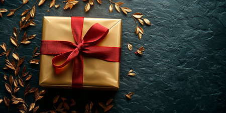 A beautifully wrapped blue gift box adorned with a golden ribbon rests on a dark textured surface, capturing the essence of holiday gifting and celebration