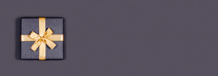 Black gift box with light golden metallic ribbon on dark background. Flat lay minimal style.