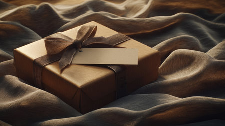 A beautiful gift box elegantly wrapped with a brown ribbon sits atop soft, flowing fabric. Ideal for showcasing holiday spirit, celebrations, and special moments.