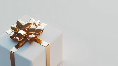 A close-up of a white gift box with a shiny gold ribbon and bow, set against a simple white background, ideal for elegant gift-wrapping concepts.