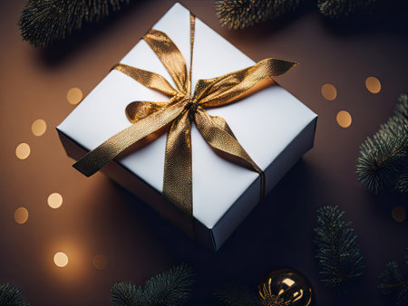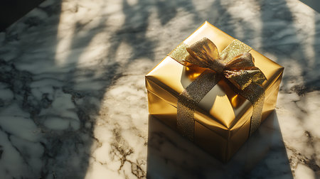 A beautifully wrapped golden gift box on a marble table capturing a festive atmosphere.