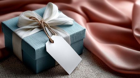 a light blue gift box with a white ribbon and tag sits on a textured surface with pink fabric behind it