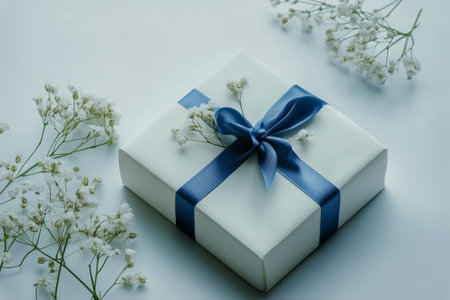 A small white gift box tied with a blue ribbon sits on a smooth surface alongside delicate blue flowers. The arrangement is simple and thoughtful, perfect for special occasions.