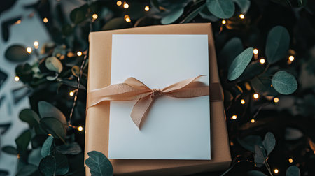 A white wedding invitation card with a satin ribbon, placed on top of a gift box, surrounded by fairy lights and greenery. The focus is on the face. --chaos 30 --ar 16:9 --v 6.1 Job ID: 9af1880d-9b7c-437a-9366-809da2eece84