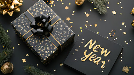 Elegant Black Gift Box with Gold Ribbon and Ornaments on Dark Textured Background Concept of Luxury Celebration Holiday Gifting Festive Decoration. Copy space.