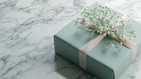 Gift box wrapped in pastel paper with gypsophila flower decoration, on a smooth marble surface generative ai