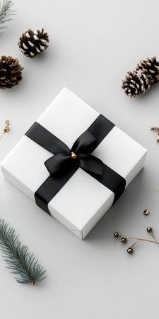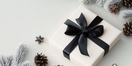 Festive Holiday Scene with White Gift Box Tied in Black Ribbon Surrounded by Pine Cones and Decor
