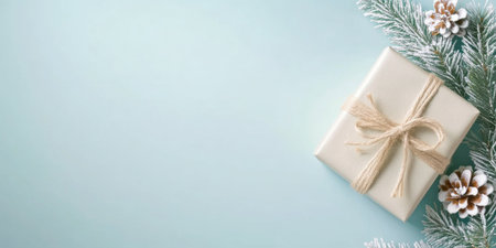 Festive gift box on a snowy pine branch background with frosty pinecones and a light blue backdrop.