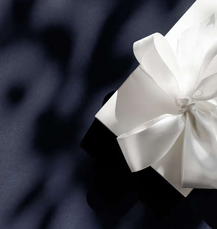 Anniversary celebration, shop sale promotion and luxe surprise concept - Luxury holiday white gift box with silk ribbon and bow on black background, luxe wedding or birthday present