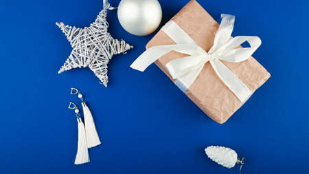 Zero waste Christmas presents with decorations on champagne colored silk background. Copy space. Eco friendly packed gift with tags from craft cardboard. New year