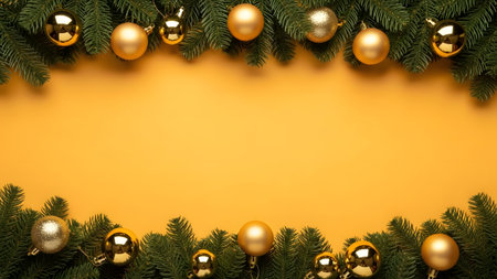 Christmas tree branches with golden balls on yellow background. Top view with copy space