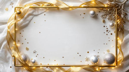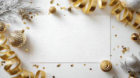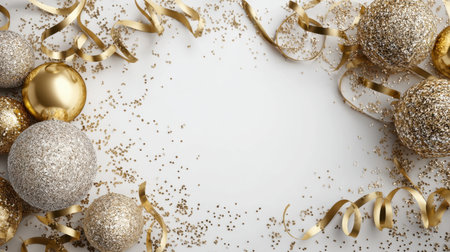 Sparkling gold and silver ornaments surround blank space, creating festive atmosphere perfect for celebrations. Glittering ribbons and confetti enhance joyful mood of scene